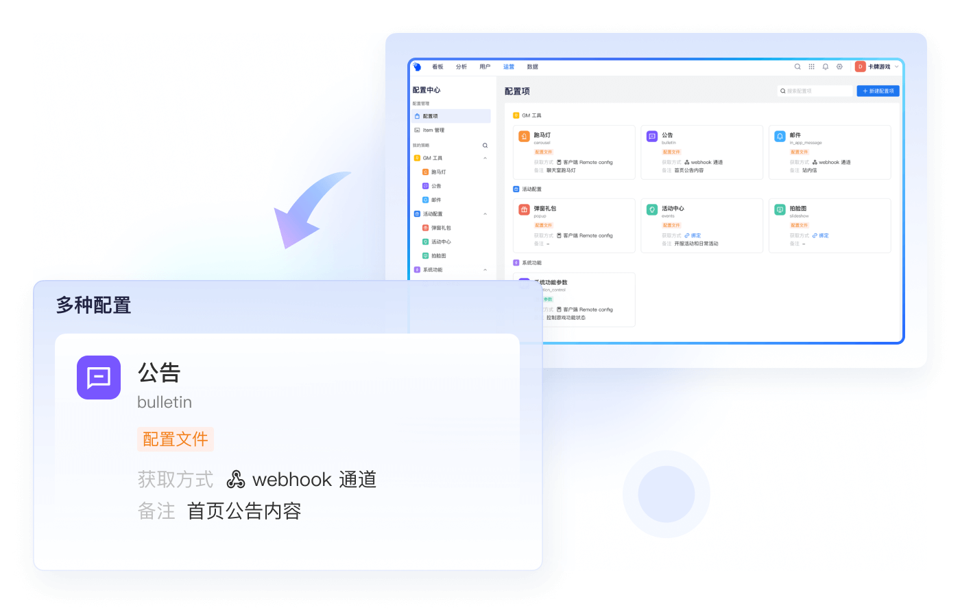 多种配置自由定制,如 GM 工具、公告、 弹窗礼包等,免去重复开发