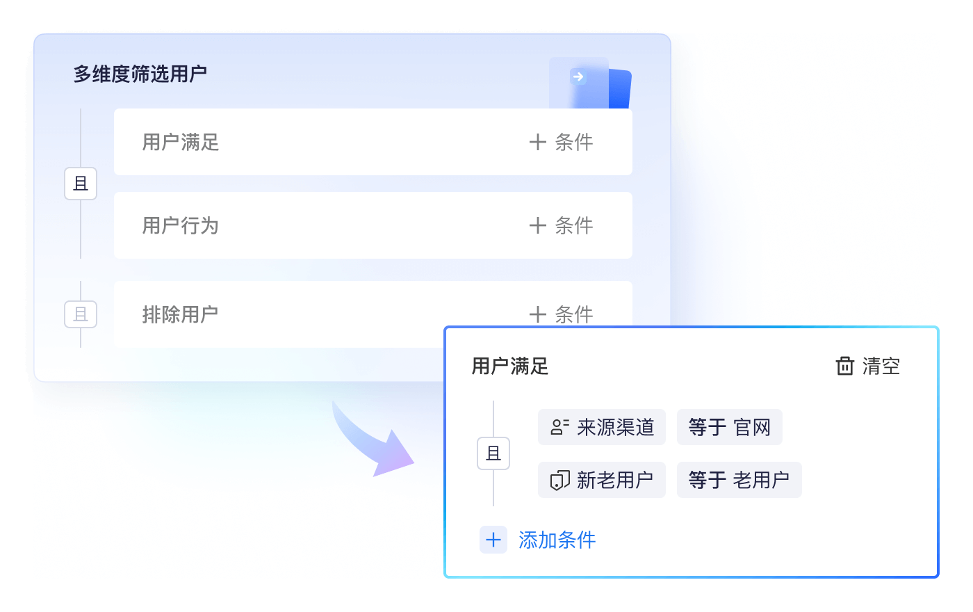 多维度筛选用户,基于用户属性、行为事件、 用户标签圈选人群
