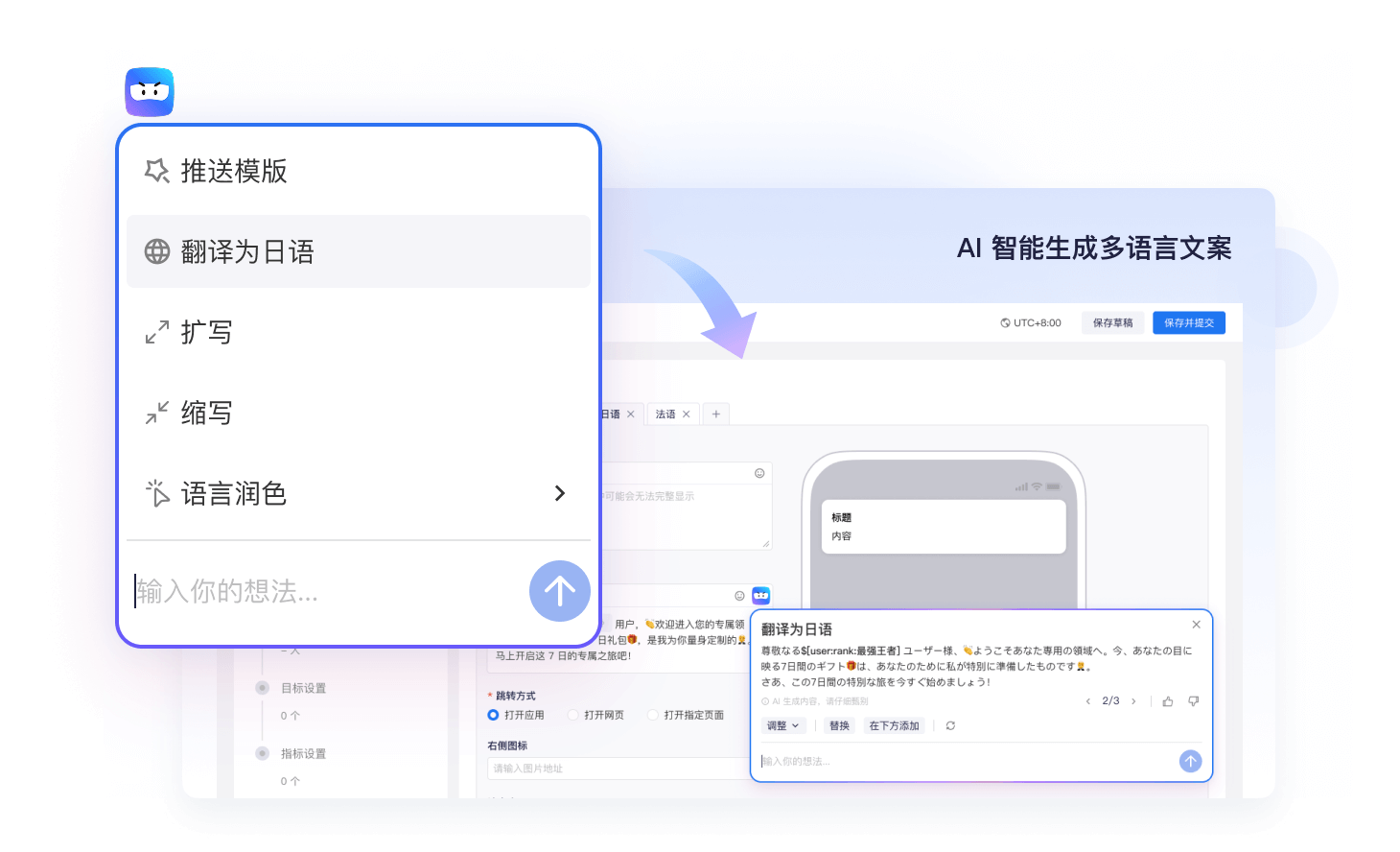 AI 智能生成多语言文案内容, 支持自动优化运营策略和人群定向