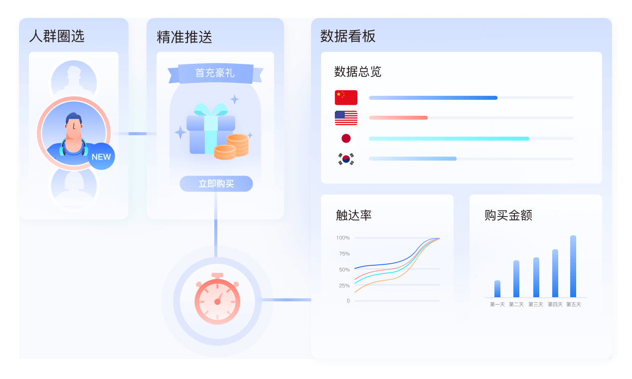 - 灵活设置定时或行为触发推送, 精准把握最佳时机,及时响应玩家需求
