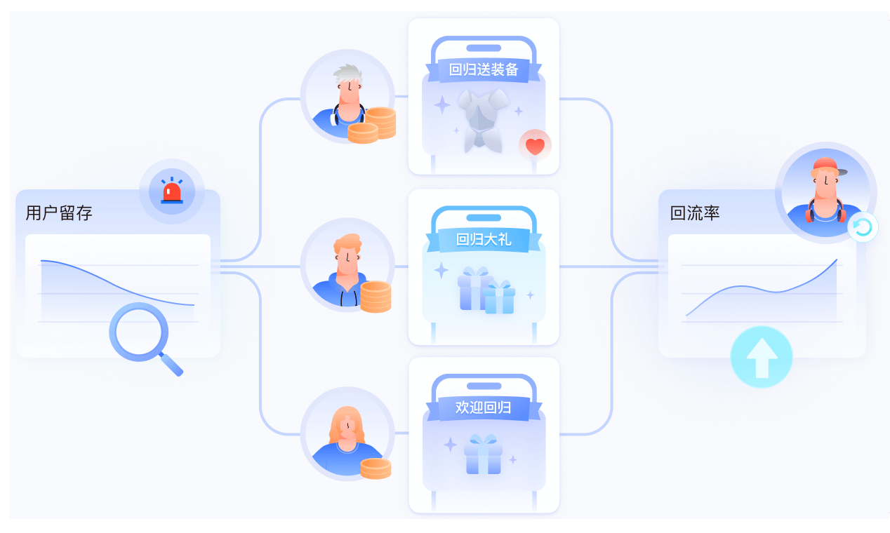 分析流失原因和玩家价值,结合新版本上线和活动节点,推送个性化召回礼包,多渠道触达沉默用户,最大化玩家回流效率。