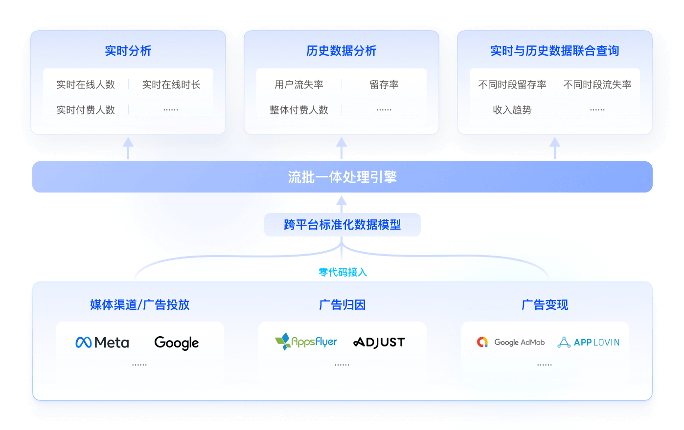 零代码数据接入能力, 快速整合广告平台、支付系统等多源数据